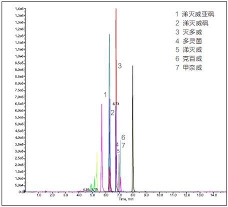氨基甲酸酯類(lèi)農(nóng)藥各組分名稱(chēng)、保留時(shí)間及母離子和子離子檢測(cè)離子對(duì):